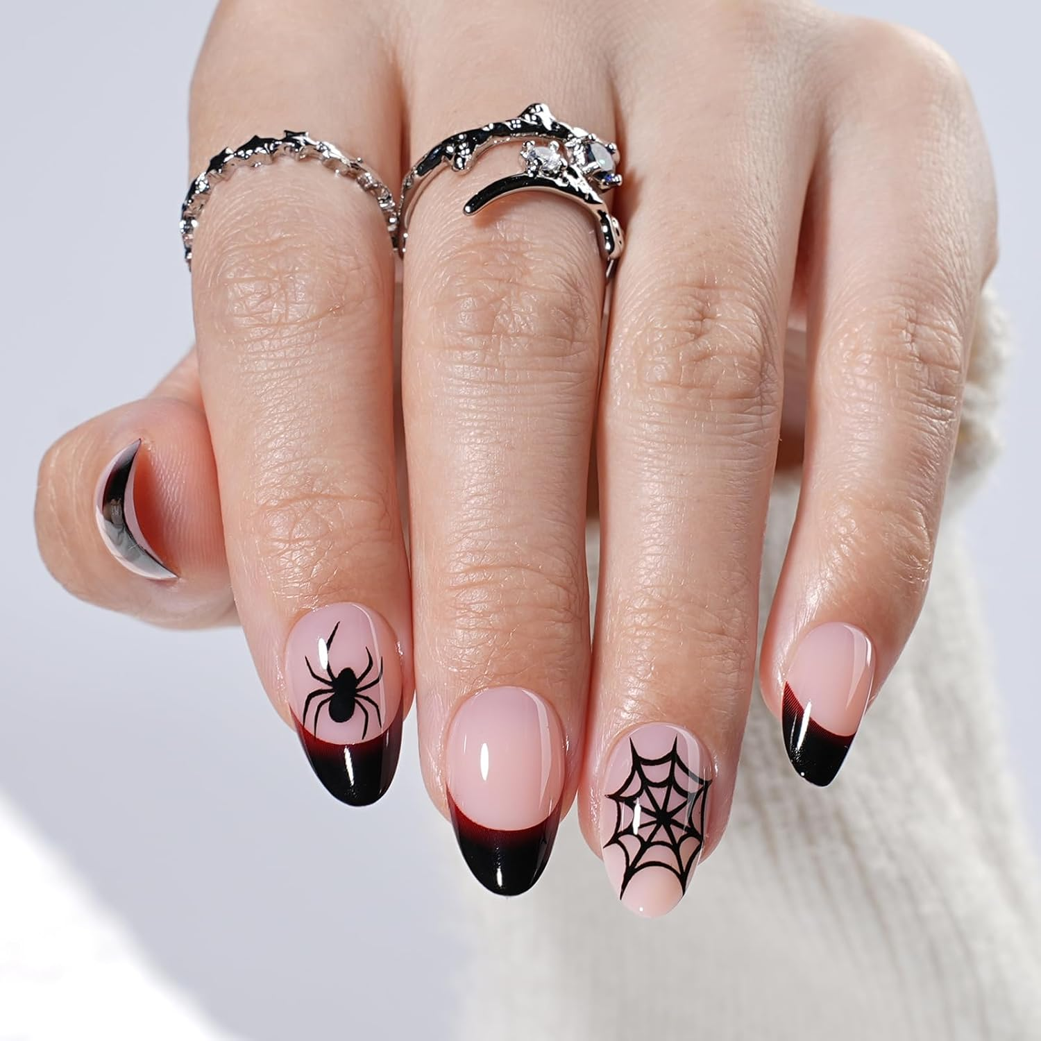 Short almond press-on set featuring printed spider-web motifs, multiple sizes, and adhesive/glue included for easy application. Fast to apply and ideal for party-ready looks.