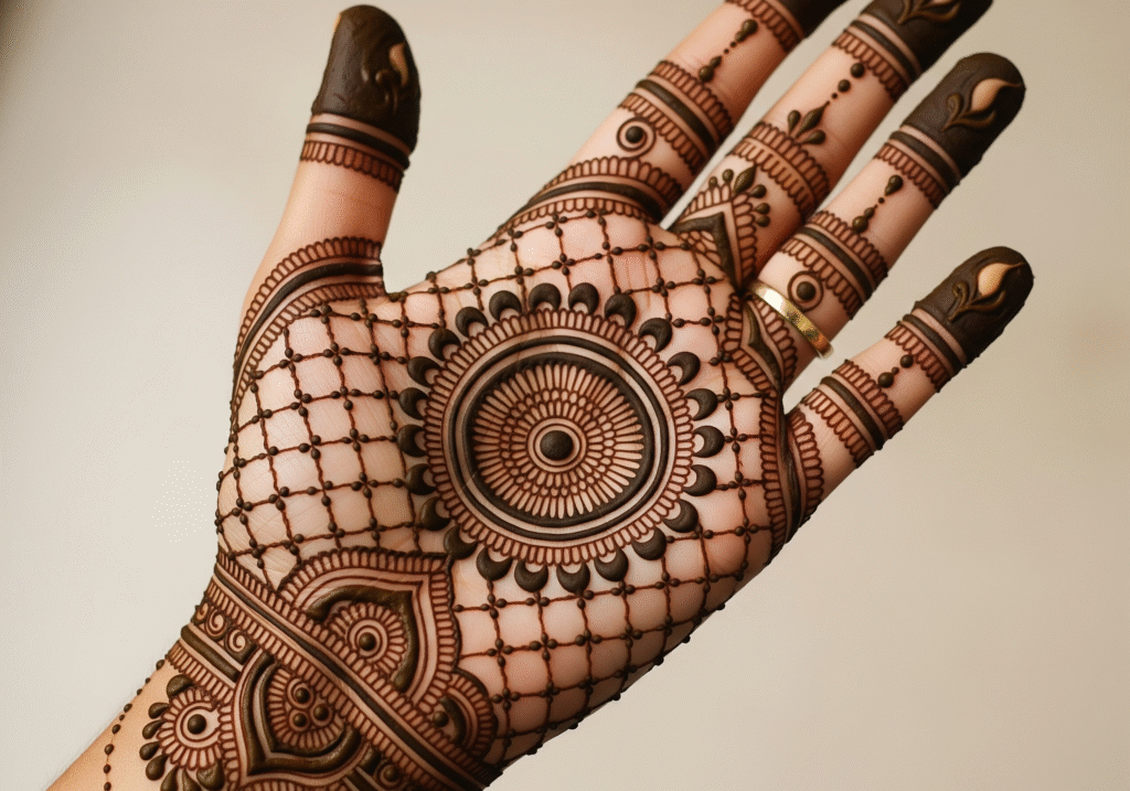 Symmetrical circles radiating harmony from your palm’s core. Ideal for yoga-loving brides seeking zen in the chaos of shaadi prep.