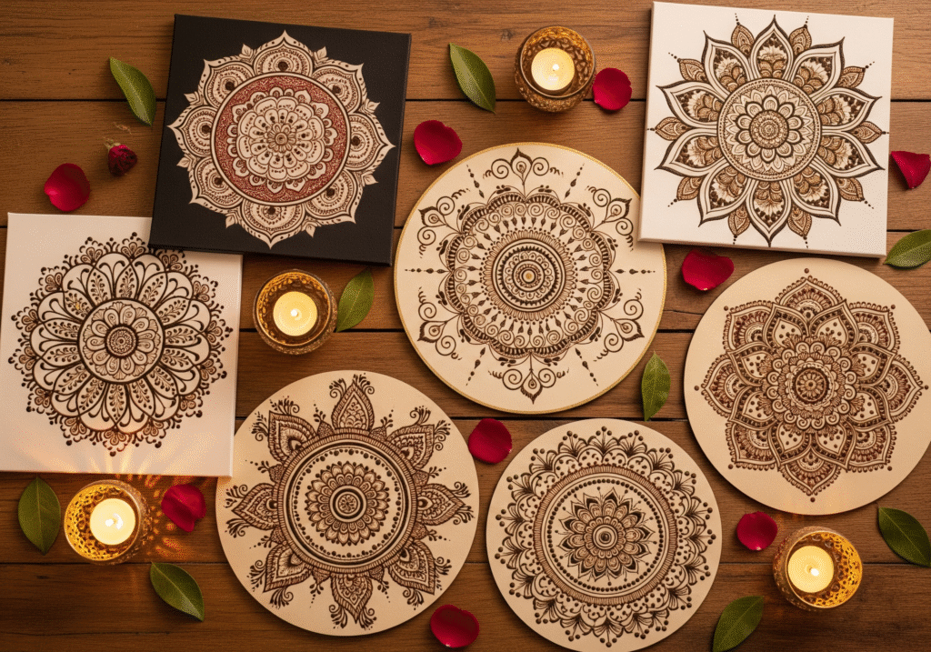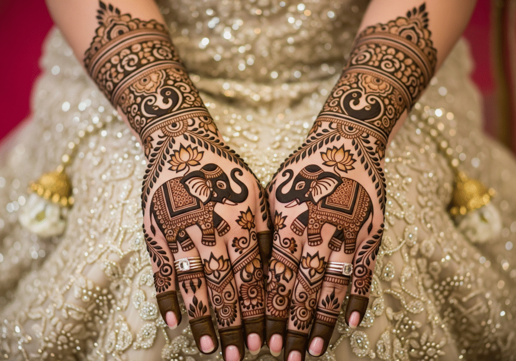Royal elephants decked in henna “jewelry” for strength and prosperity. A regal pick for elephant-blessed ceremonies—think South Indian vibes.